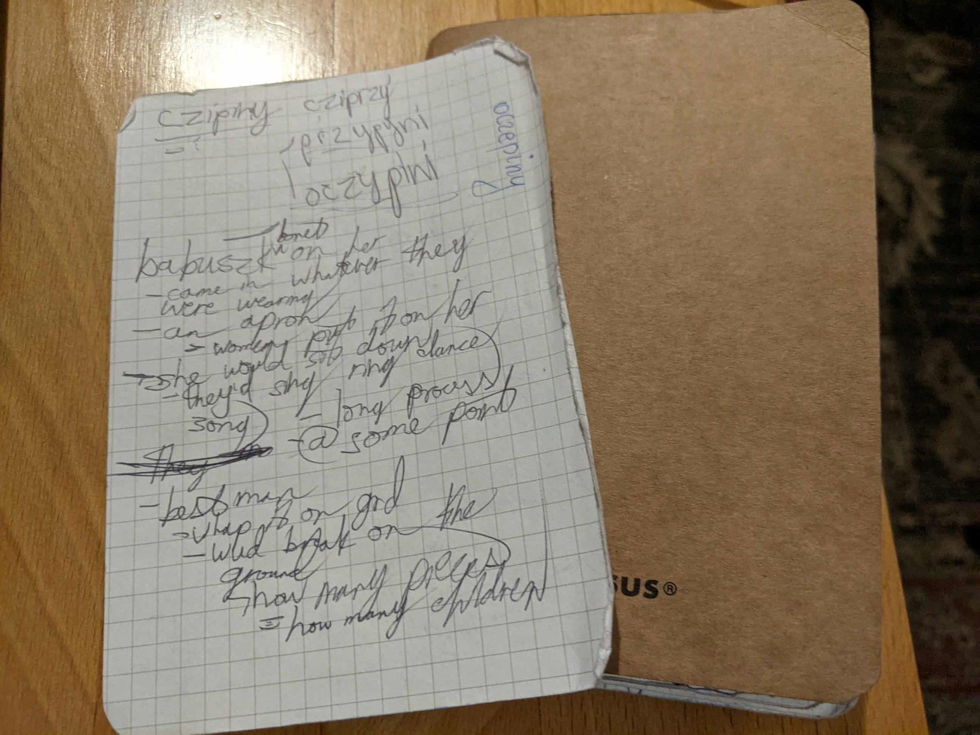 Po prawej: Notatki z wywiadu, w których przywołano polonijne obrzędy weselne z Nebraski lat 50. XX wieku. Utrzymuję stały kontakt z zespołem i planuję dalsze rozwinięcie badań. Pozostaję również w początkowej fazie współpracy z doktorami z Podhala, z którymi konsultuję i współprowadzę część tego projektu badawczego.