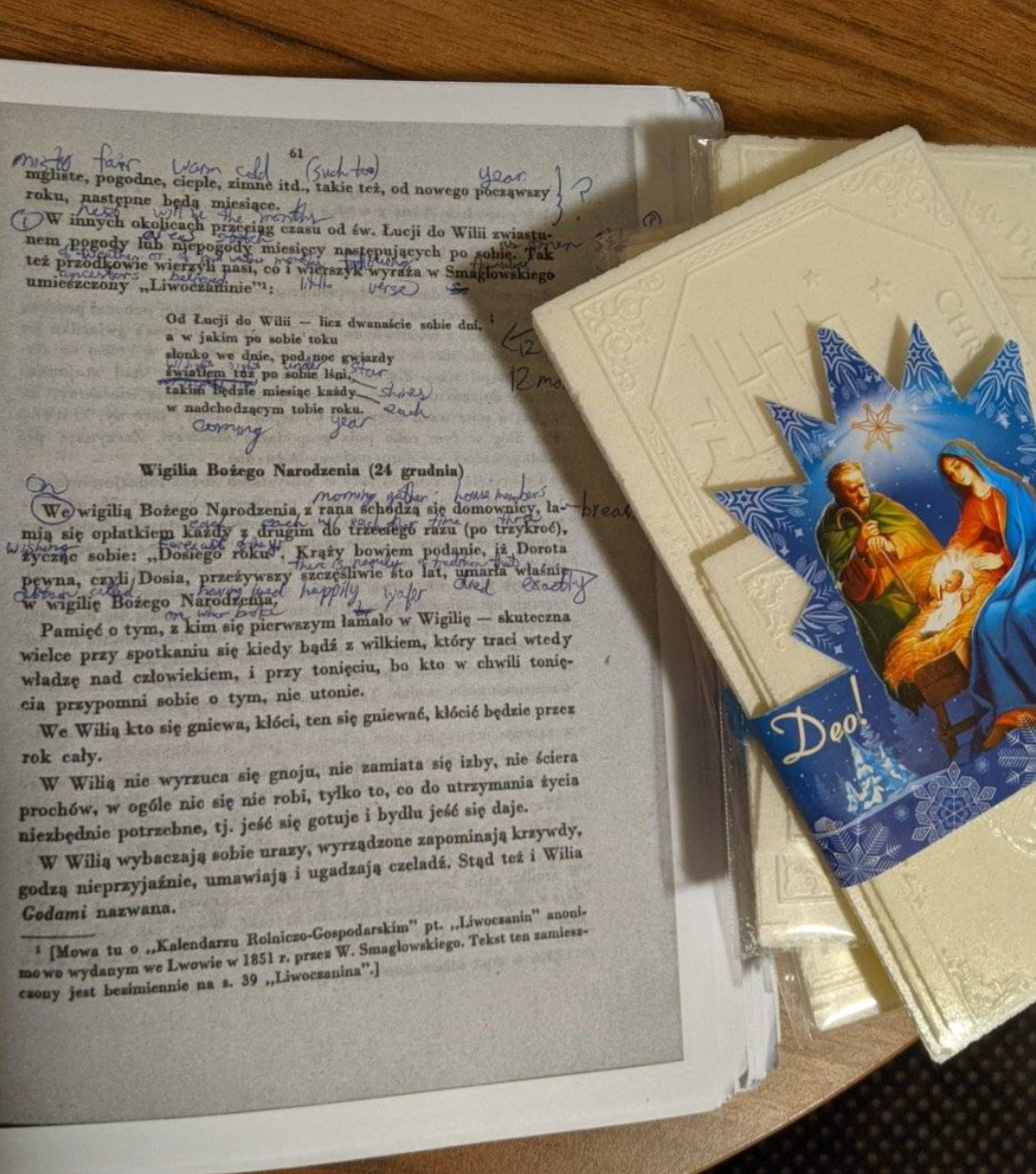 Po lewej: uwagi Oskar Kolberg, wybitnego polskiego etnografa, dotyczące tarnowskiego opłatka. Przetłumaczyłem je ręcznie, aby sprawdzić, czy ta tradycja była niegdyś obecna w pamięci mojej rodziny.